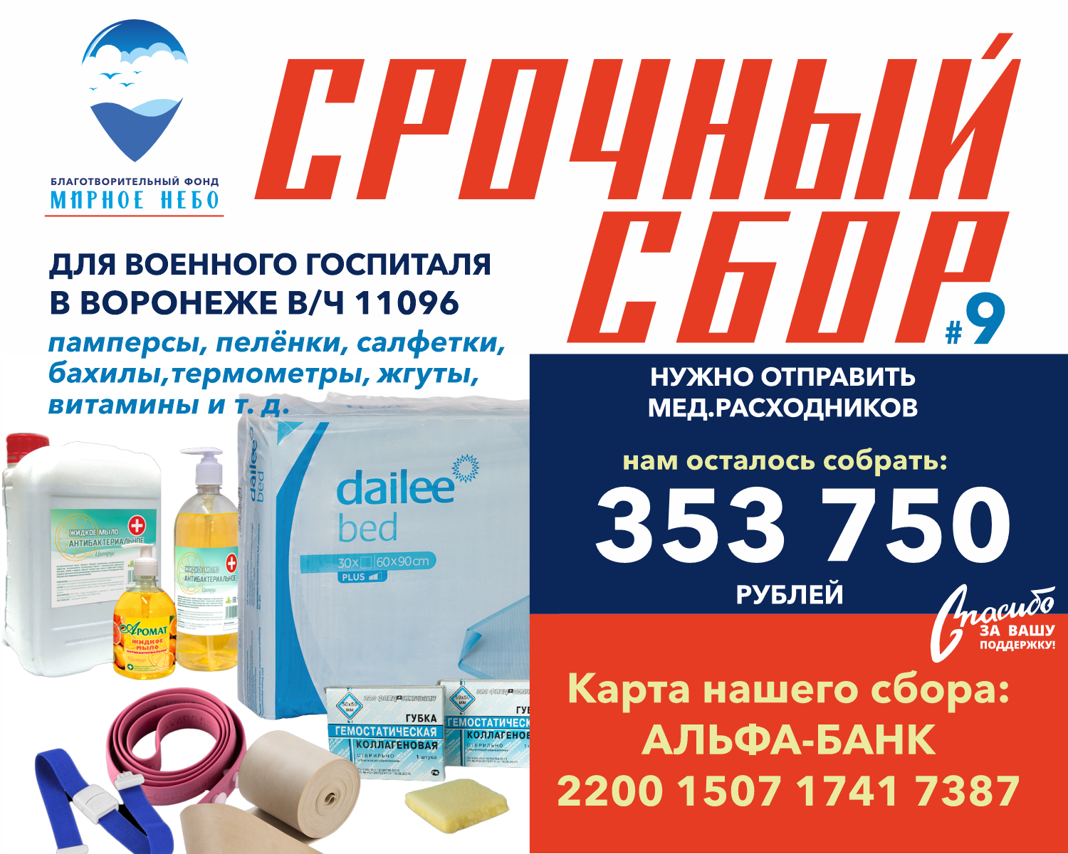 Просим всех у кого есть возможность помочь со сбором медицинских расходников, связаться с нашим председателем Фонда Мирное небо Олегом Степановичем +7 985 889-97-67,+7 985 265-44-48 или сделать пожертвование на карту нашего сбора: